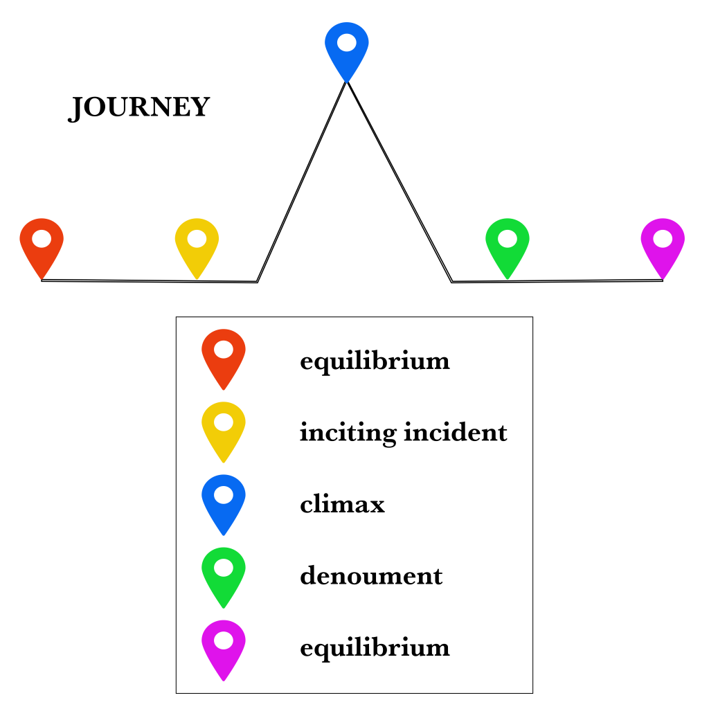 A Journey always moves from point A to B, equilibrium to equilibrium. Point A is when the hero obtains the goal. Point B is when the goal is achieved. Point A is the beginning and Point B is the endpoint. The endpoint must be a solid, clear goal. The audience will know the exact point the hero has achieved the goal.