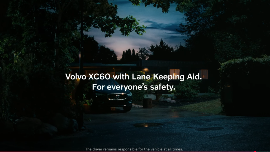 The tagline: “The car that looks after you, like you look after others.” It’s followed with one other line: “Volvo XC60 with Lane Keeping Aid. For everyone’s safety.”