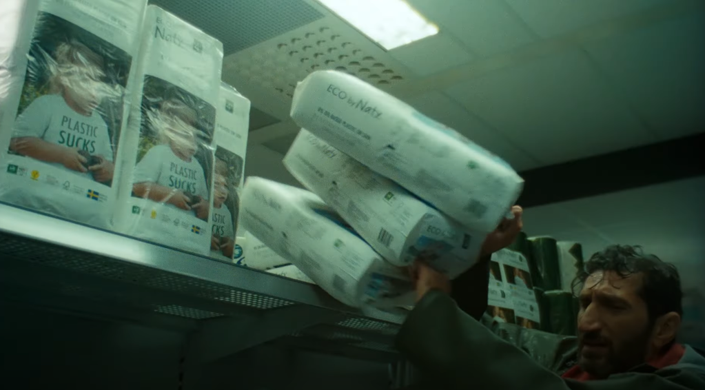 The commercial focuses on diapers in relation to taking care of children, which, I think all would agree, is some of the dirtiest, least appealing aspects of parenthood. The multiple packages of diapers they purchased demonstrate they’ve done a lot of dirty work. Diapers also represent protection. A baby wears diapers that must be changed for health reasons. Keeping children clean from potentially dangerous bacteria is vitally important.