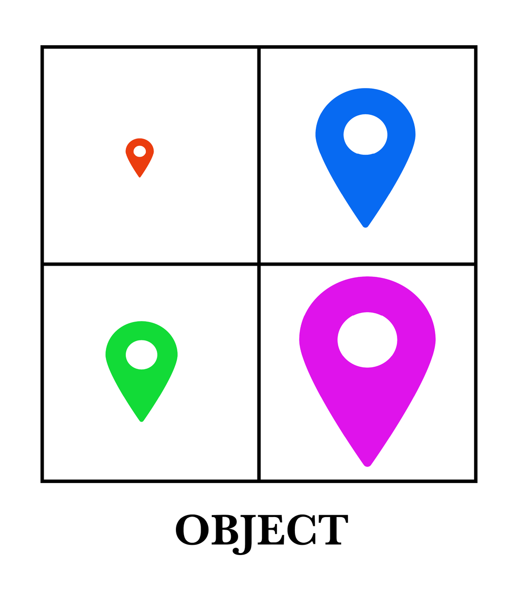 The diagram [above] has four location points in separate boxes. All four boxes are in one box. This creates a collection of points. We observe the collection as one piece comprised of individual pieces. We can look at each piece in contrast to the others. We can form opinions about the arrangement and how that creates its own effect. We can look at the spacing, the choice of colors, thinness of the lines, etc.