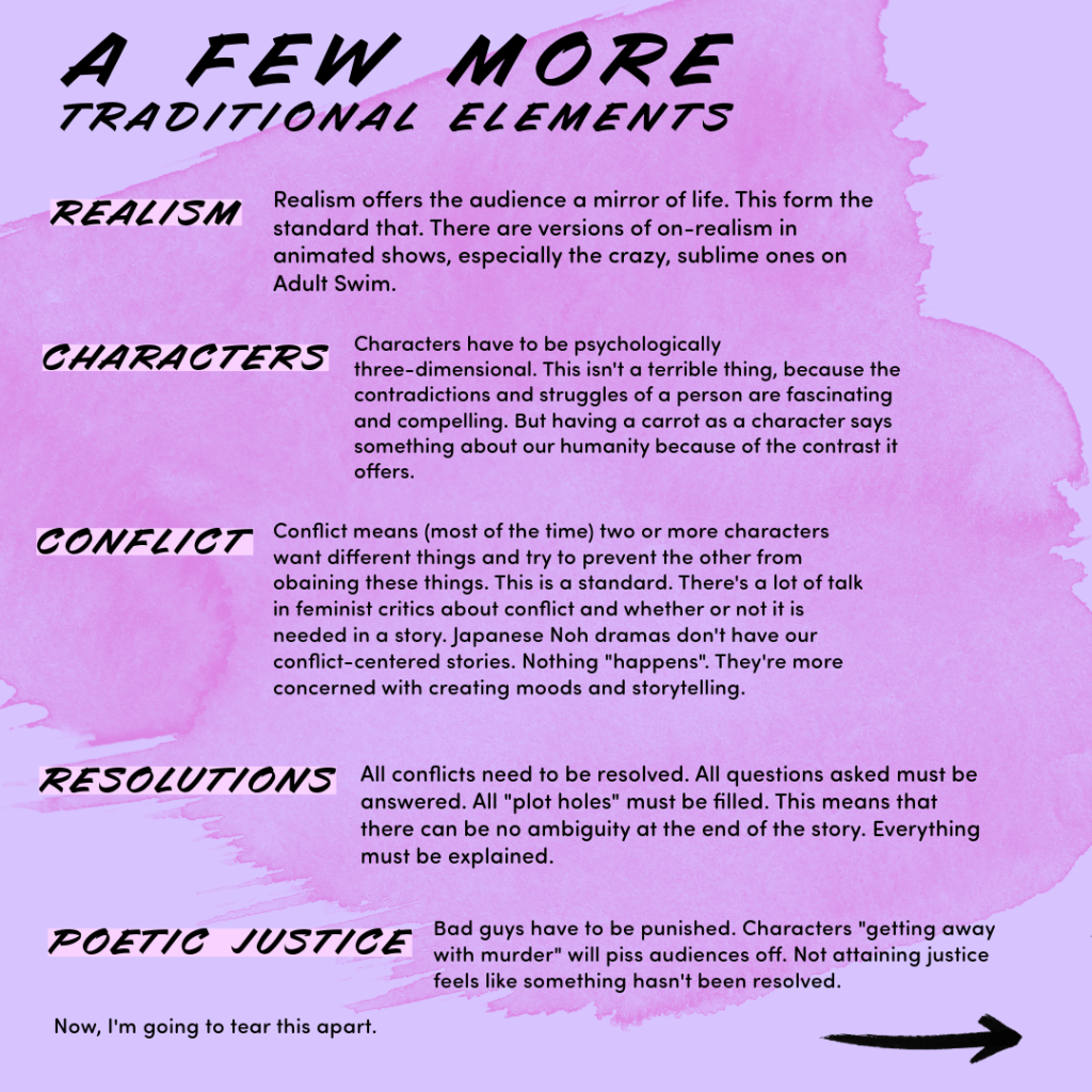 This plot structure is very focused upon a hero making a journey in order to complete a goal (which will also change their character), facing obstacles, achieving a climax, and bring the world back to a state of calm equilibrium. Characters around the hero assume a pyramid like structure of importance; those of lesser importance tend to be flat and not important enough to pay attention to. Characters appear in the story to help or hinder the hero's goal. All actions have meaning. Everything that is happening has an overarching meaning. And, most galling to me, it has a beginning, middle, and an end.