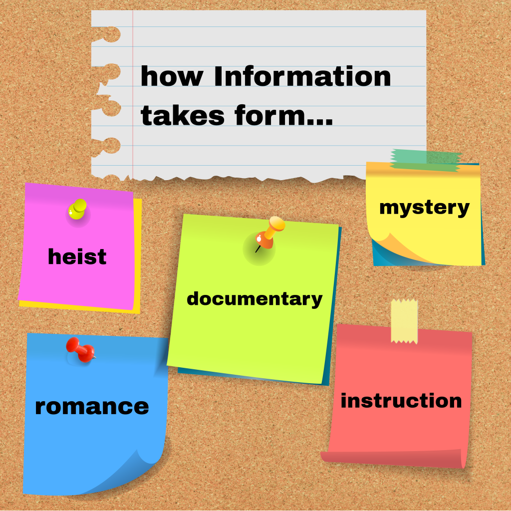 Anything with an Information structure begins with a mystery, thesis, or puzzle. Characters can be seeking to reveal a mystery, put information in the right sequence to solve a puzzle, or prove a thesis.