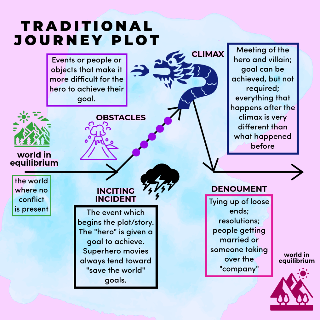 In order to maintain clarity, I'll take this piece by piece. A traditional plot structure I will refer to as a Journey structure. A main character has a goal to achieve and the events of the story are about reaching that goal. There are obstacles, a climax, and an ending. Almost every mainstream book, TV show, and movie follow this structure. It is so common, no one questions it. It is seen as the "right" way to construct a story.